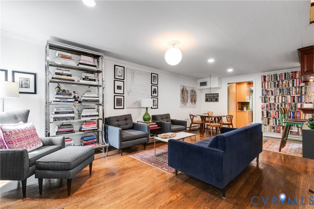 Charming and thoughtfully renovated brick rowhouse in the heart of the Museum District offering stylish updates, great flow, and inviting indoor/outdoor living. The first floor features an open living room with hardwood floors, crown molding, a striking painted plank ceiling, and a custom lacewood dry bar perfect for entertaining or a flexible workspace. A convenient powder room has been added by the current owner. The renovated kitchen boasts stone countertops, natural custom cabinetry by Trademark, gas cooking, stainless sink, pantry storage, and a full-size washer and dryer, with direct access to a private deck and bricked-in pocket garden. Upstairs, two spacious bedrooms feature hardwood floors, lovely millwork, and abundant natural light, including a rear primary with walk-in closet and a front bedroom with built-in desk and bookcases. The full hall bath is updated with a stone vanity and subway tile surround. Outdoor spaces include a covered front porch with eastern views, raised garden beds, and a fenced rear garden with alley access and storage shed. Additional highlights include newer windows, TPO roof, updated HVAC, and freshly painted exterior. Ideally located on a quiet one-way street with alley access. This idyllic location is quiet, but also steps to the VMFA and all Carytown has to offer.